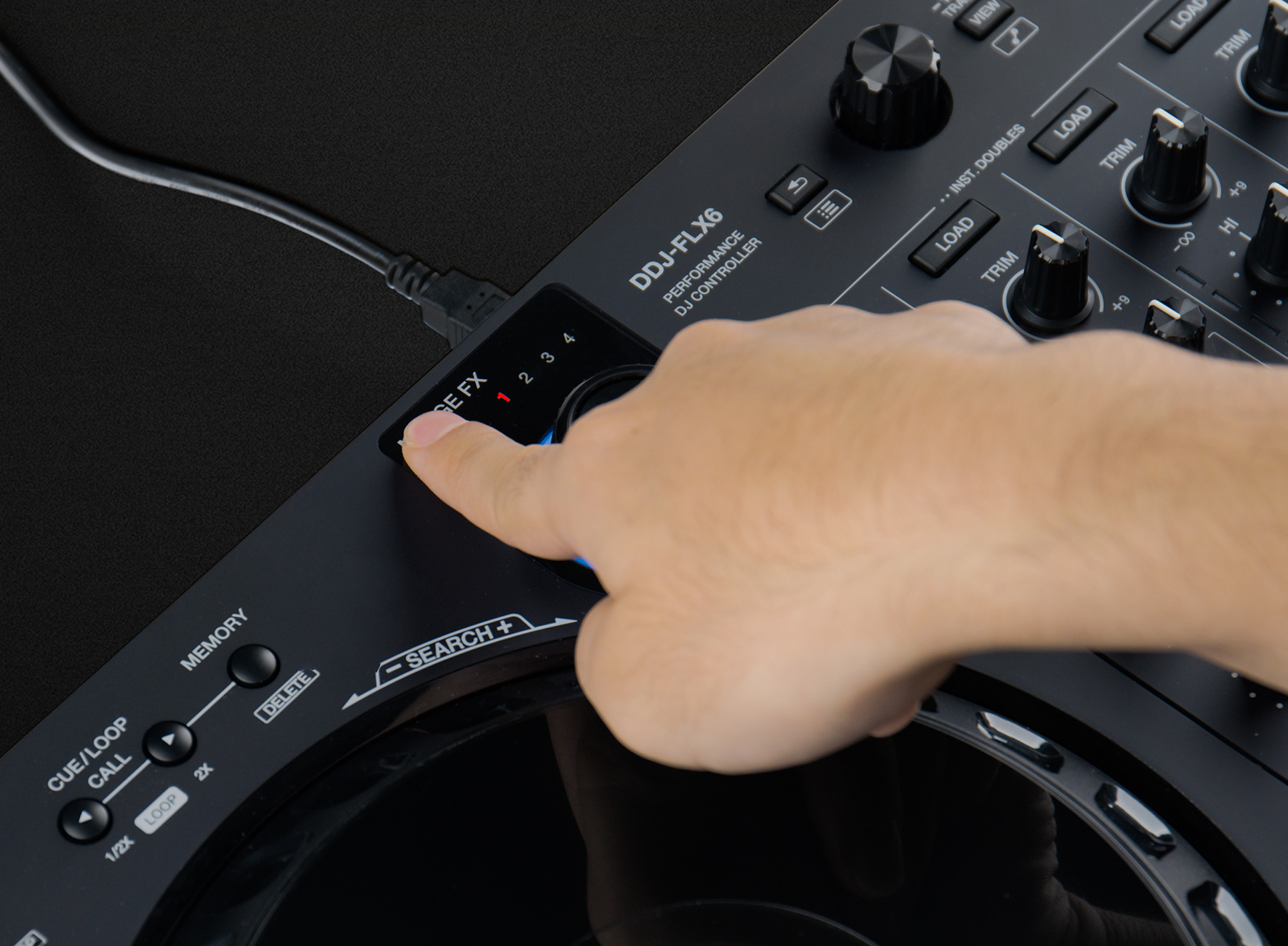The layout of the controls on the DDJ-FLX6 is similar to that on our club-standard CDJ + DJM setup, so you can perform intuitively. However, this DJ controller introduces a fresh look, with a high-quality dark-gray matte finish and redesigned jog wheels that will make your setup stand out.