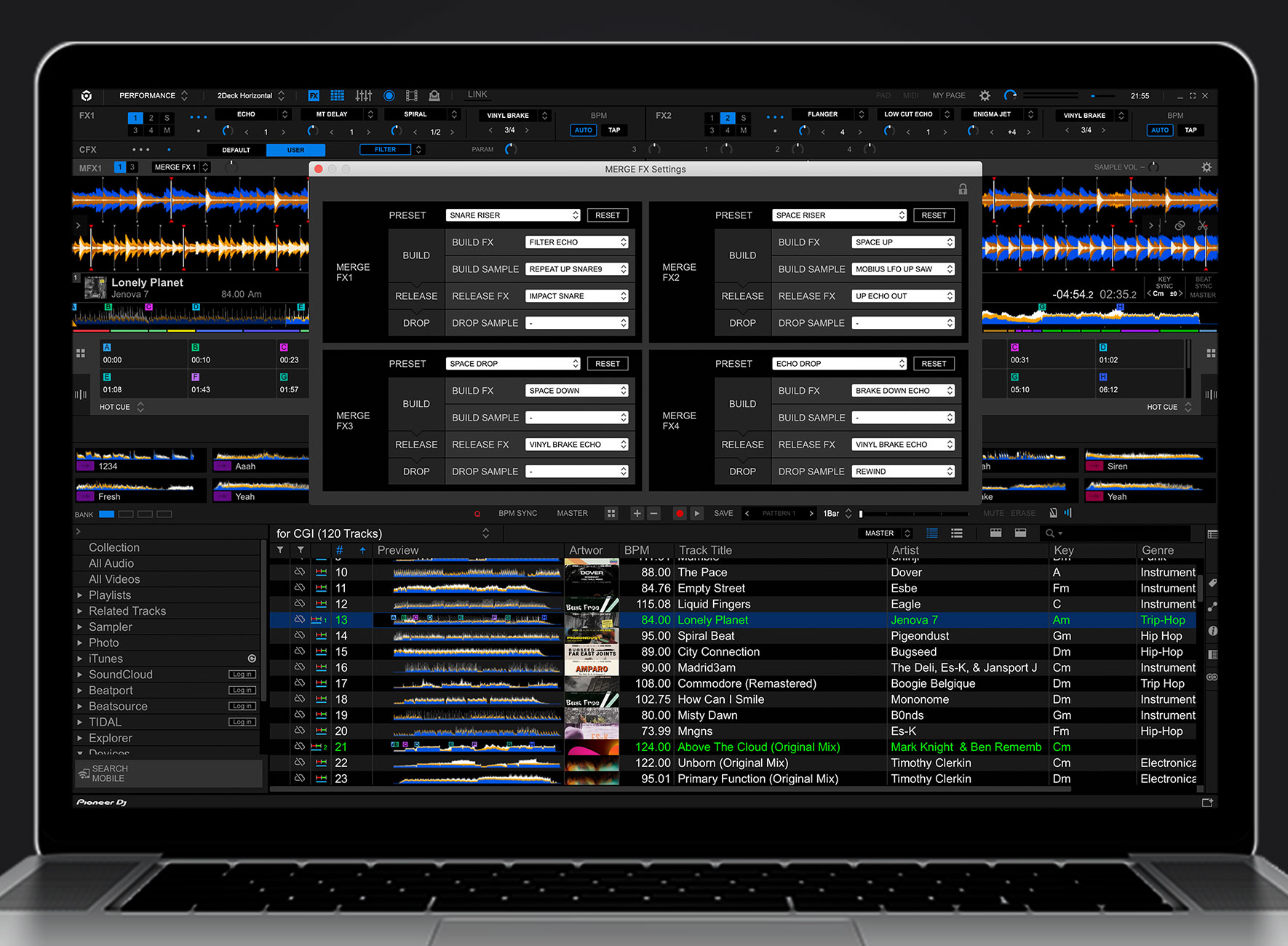 In the new Merge FX section in rekordbox (PC/Mac), you can customize each effect type and the samples used in each pattern to create your own variations. Choose from 41 types of effect for each element (Build FX, Build Sample, Release FX, and Drop Sample) and combine them to create more than 9,000 different patterns.