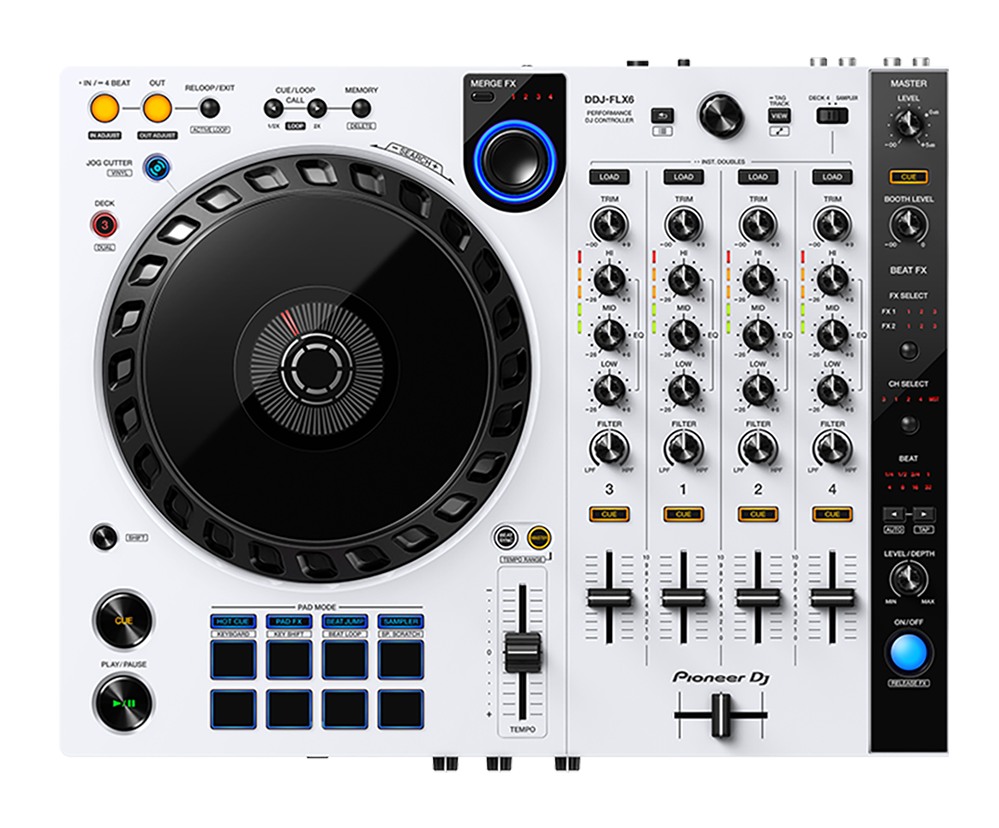Bring a contemporary, fresh look to any event, livestream, or home setup you’re playing with this distinctive white controller. The DDJ-FLX6-W is sure to catch the eye of your audience with its unmistakable white body, which accentuates the black jog wheels, knobs, and faders.