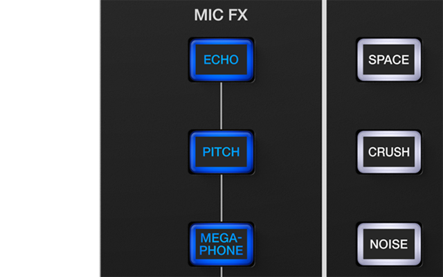 The phantom powered input means you can connect a high-quality condenser mic directly to the DJM-A9, a feature never seen before on a DJ mixer. And there are 3 new microphone effects (Echo, Pitch, Megaphone) with a dedicated reverb effect so you can change the sound of your voice and hype up the crowd with your vocals.