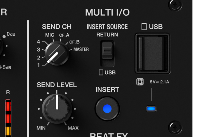 Connect 2 different PC/Mac systems at the same time thanks to the dual USB Type-B and USB Type-C ports (there are 2 of each) for seamless transitions between DJs and easy back-to-back sets. And, thanks to a Bluetooth® input which you can route to any channel on the DJM-A9, you can wirelessly drop audio tracks into your sets from other devices such as smartphones and use all the mixer’s features and effects to change the sound. The Multi I/O section has an independent channel selector so external effects can be used separately from Beat FX, giving the DJM-A9 true send capabilities. This means you can route the effected sound from an external unit such as an RMX-1000 or a delay pedal to a separate channel instead of the channel it came from.